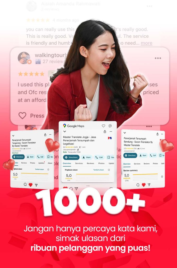 Penerjemah Tersumpah Jakarta - Sworn Translator By Master Translate 317 Google reviewsPosted on Aurora utara2025-10-08Trustindex verifies that the original source of the review is Google. Pelayanan ramah, dokumen 1 hari selesai dan untuk harga juga affordable. So far hasil terjemahan sesuai dan gaada typo 🙌🏻Posted on Sasa2025-10-08Trustindex verifies that the original source of the review is Google. Penerjemahnya benar-benar profesional dan teliti. Hasil terjemahannya akurat banget, gampang dipahami, dan tetap sesuai sama makna aslinya. Kerjanya juga cepat dan rapi. Pokoknya recommended banget!Posted on Anugrah Widodo2025-10-07Trustindex verifies that the original source of the review is Google. Mantab cepat dan murah serta Satset bgt..Posted on Wan Subrata2025-10-07Trustindex verifies that the original source of the review is Google. Service baik dan sangat cepat penanganannyaPosted on Maraya Yuli Indralia2025-10-07Trustindex verifies that the original source of the review is Google. Adminnya sangat ramah dan fast resp! Proses pengerjaan dokumen juga cepat dan sat set banget. Overall puas dan okay!! Thank you master translate 👍🏻👏🏻Posted on Y Darma2025-10-06Trustindex verifies that the original source of the review is Google. Terjemahan cepat 1 hari jadi dengan tarif yang terjangkauPosted on gupita sari2025-10-06Trustindex verifies that the original source of the review is Google. Patut dapat bintang 5+. Pelayanannya sangat sesuai harapan, ramah, efektif dan efisien. Timnya juga komunikatif. Terima kasih! Semoga sukses selalu.Posted on mia indah2025-10-06Trustindex verifies that the original source of the review is Google. Pelayanan baik dan cepatPosted on linda theresia2025-10-04Trustindex verifies that the original source of the review is Google. Proses sangat Cepat, Pelayanan memuaskan. Menjawab kebutuhan customer.Posted on Yulia Windyastuti2025-10-04Trustindex verifies that the original source of the review is Google. Cepat dan akurat 👍👍👍Verified by TrustindexTrustindex verified badge is the Universal Symbol of Trust. Only the greatest companies can get the verified badge who has a review score above 4.5, based on customer reviews over the past 12 months. Read more